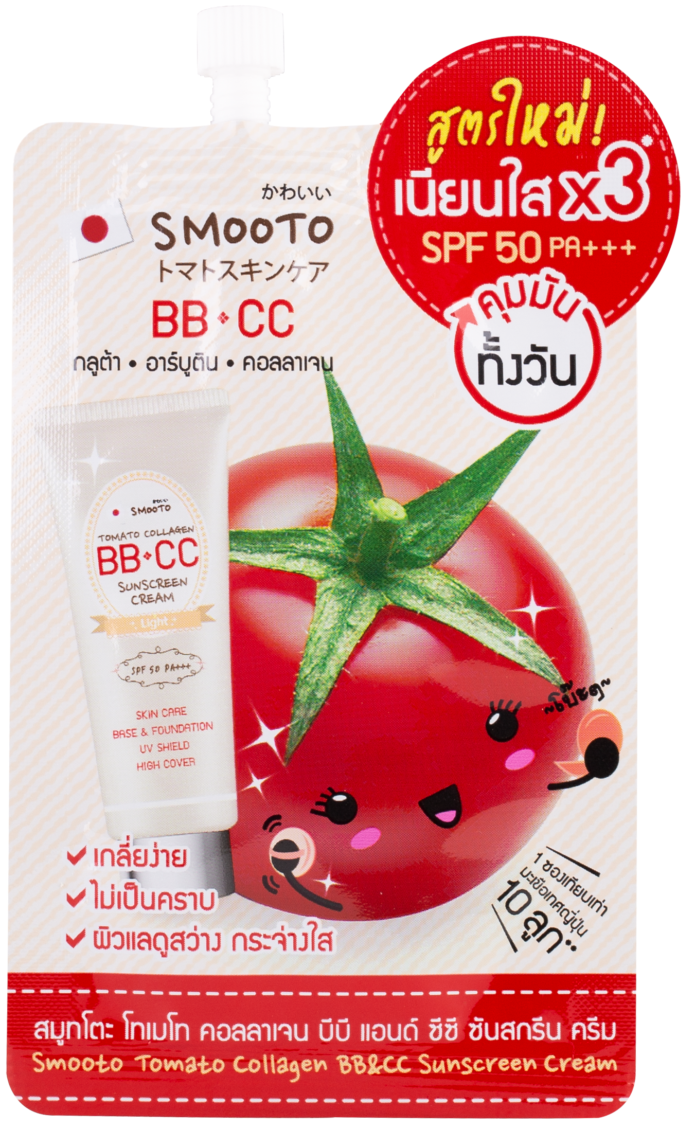 รูปแบบซองที่มีเจ้ามะเขือเทศแปะอยู่หน้าซอง สีสันสดใส เห็นแล้วเป็นที่จดจำ ที่เป็นทั้งบีบีและซีซีครีมในซองเดียวกัน ช่วยในการปรับสีผิว โชว์ผิวเนียนใส เป็นธรรมชาติ ป้องกันแสงแดด SPF30 และบำรุงผิวด้วยสารสกัดมะเขือเทศ แถมยังถูกและดี ตามสรรพคุณที่ทางแบรนด์ว่าไว้คือตัวนี้จะให้ผิวหน้าที่เนียนเรียบ อมชมพู กันแดดได้ 30 เท่า หรือเทียบเท่ากับมะเขือเทศ 10 ลูก แน่ะค่ะ ความพิเศษอีกอย่างเมื่อเราทาครีมลบไปกับผิวหน้า ครีมจะแตกตัวเป็นหยดน้ำและซึมซาบเข้าสู่ผิวอย่างรวดเร็ว ทำให้ผิวดูสว่าง กระจ่างใส ดูสุขภาพดีขึ้นอย่างกับสาวญี่ปุ่นเลยค่ะ